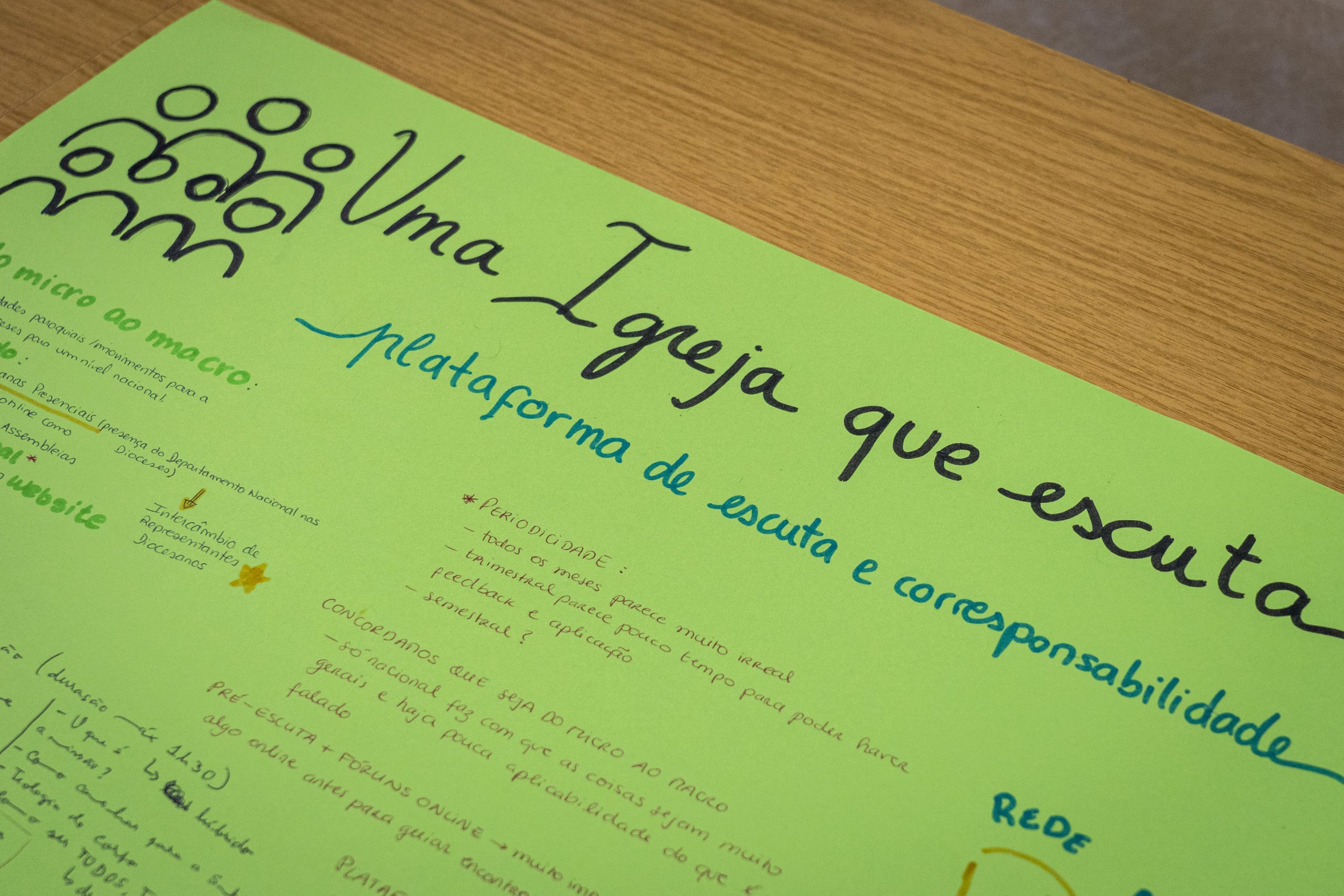 Foi proposto um modelo que parte das realidades locais, paróquias, movimentos e dioceses, e converge para o nível nacional, combinando assembleias presenciais, fóruns online e momentos de pré-escuta. A periodicidade trimestral e a apresentação pública dos resultados, através de um website interativo, foram identificadas como fatores de credibilidade, transparência e confiança.